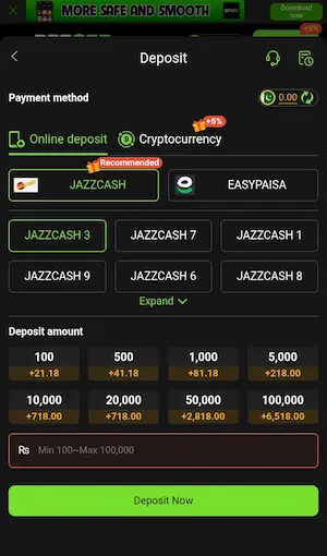 Players can deposit funds quickly using popular payment methods such as Easypaisa, JazzCash, Bank Transfer, or USDT. The process is secure and straightforward.